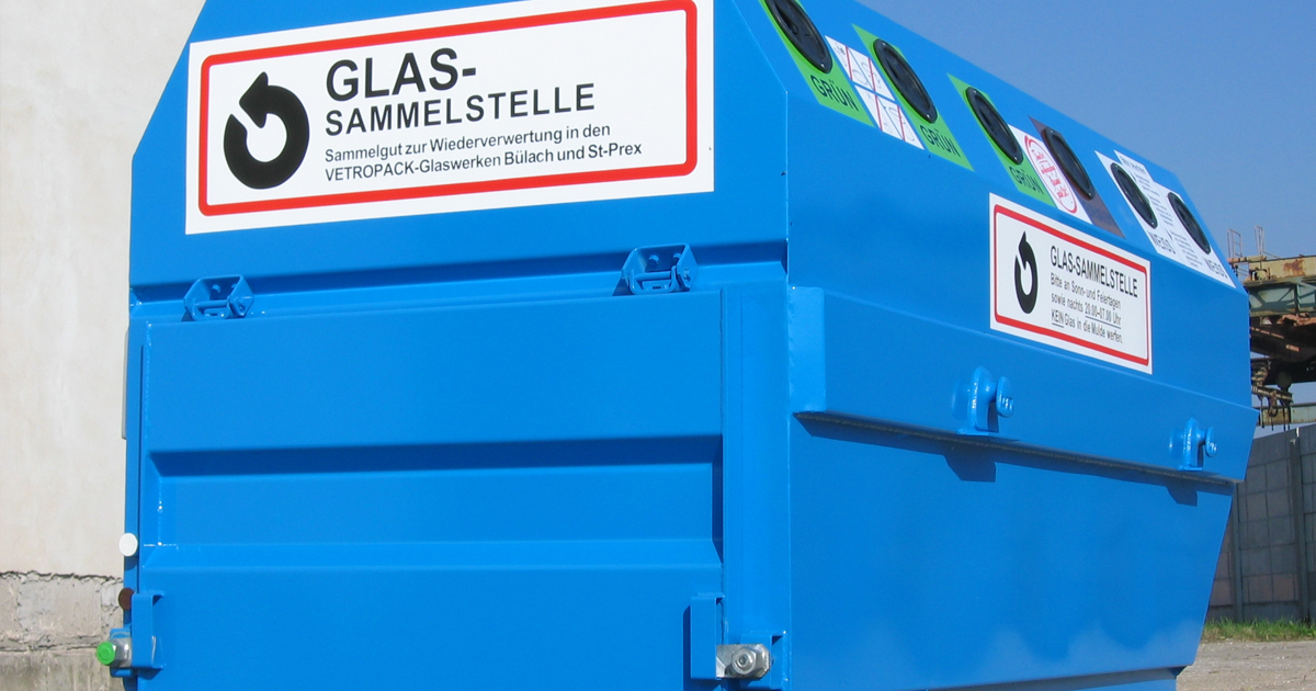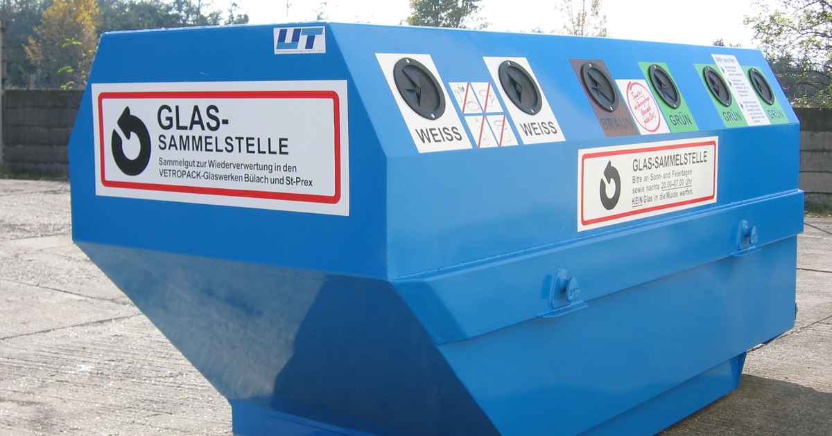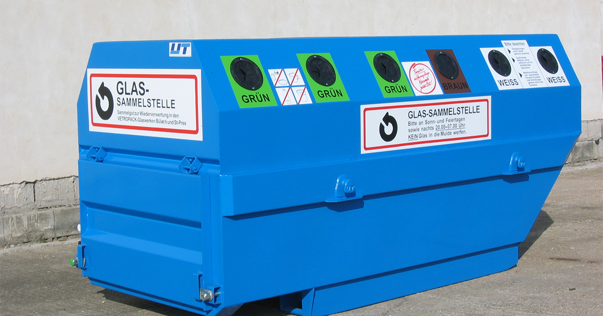 Glas sammeln, wie es sich in jeder Gemeinde gehört: Die UT-Glassammelstellen gibt es in verschiedenen Ausführungen und mit Unterteilungen nach Wahl. Der Boden der Mulden ist mit einer Gummimatte belegt.