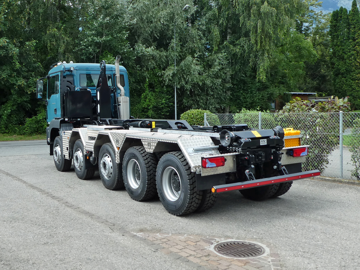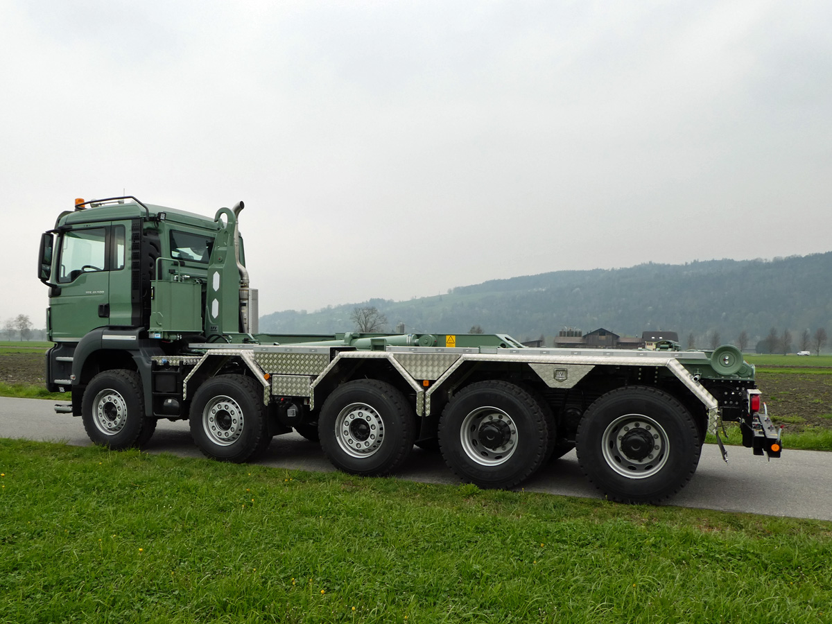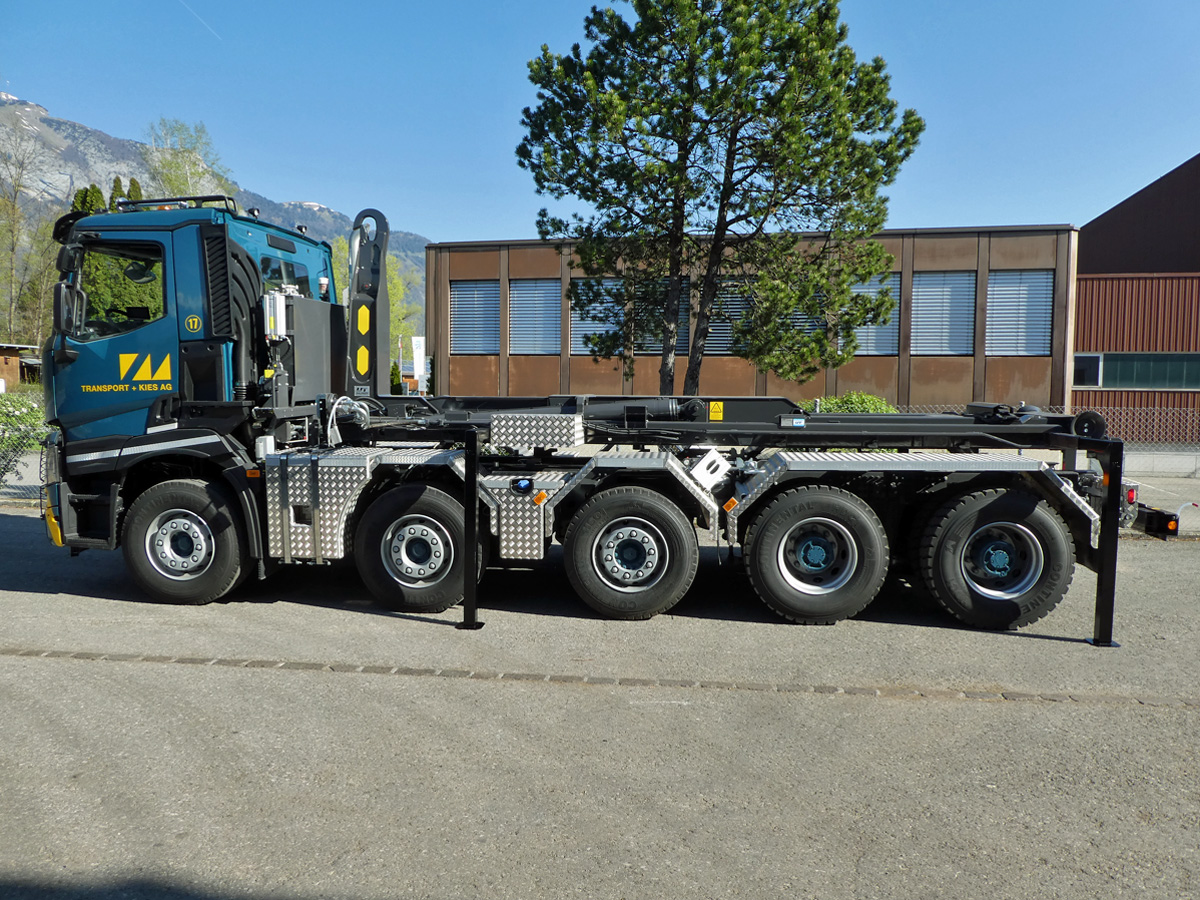 Hohe Nutzlast, hohe Hebekraft: Der Haken-Abrollkipper SAURIER 5-Achser 32TR ist für die tägliche Bewältigung von Schwerlasten konzipiert. Er weist eine Hebekraft von 32 Tonnen auf. Die grosse Kippstabilität und das robust aufgebaute Hakengerät gewährleisten ein hohes Mass an Sicherheit. Der von UT eigens für Fünfachser konzipierte Abrollkipper ist dank kurzen Aufbauzeiten schnell verfügbar.