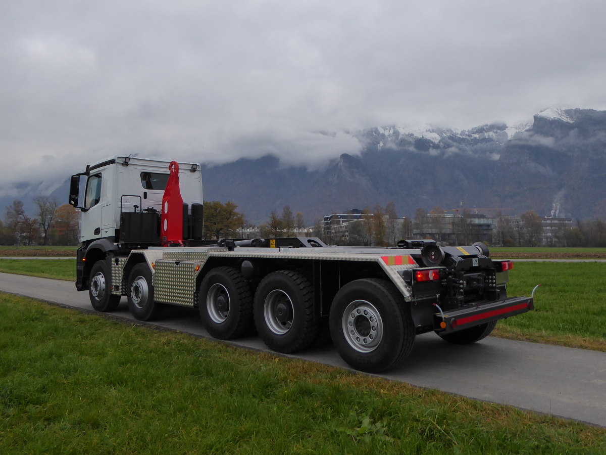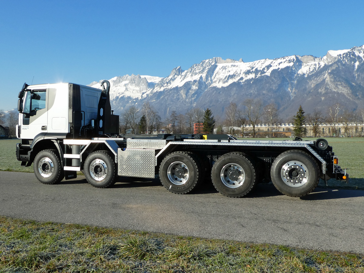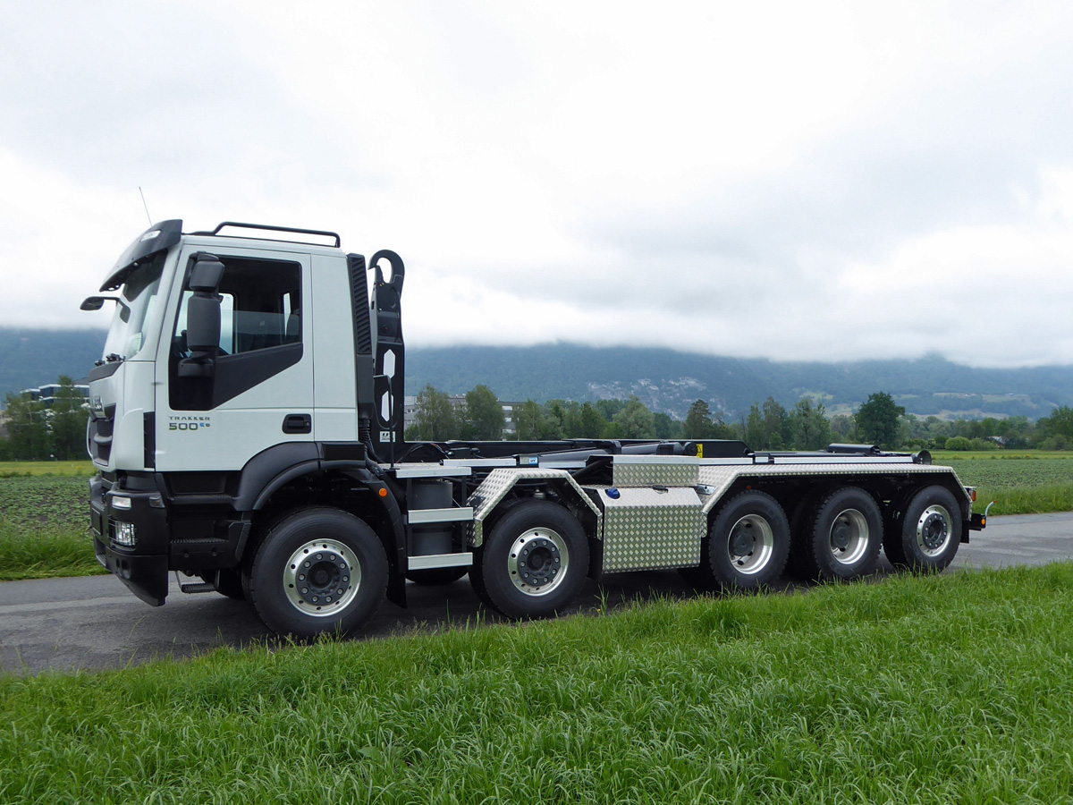 Hohe Nutzlast, hohe Hebekraft: Der Haken-Abrollkipper SAURIER 5-Achser 32TR ist für die tägliche Bewältigung von Schwerlasten konzipiert. Er weist eine Hebekraft von 32 Tonnen auf. Die grosse Kippstabilität und das robust aufgebaute Hakengerät gewährleisten ein hohes Mass an Sicherheit. Der von UT eigens für Fünfachser konzipierte Abrollkipper ist dank kurzen Aufbauzeiten schnell verfügbar.