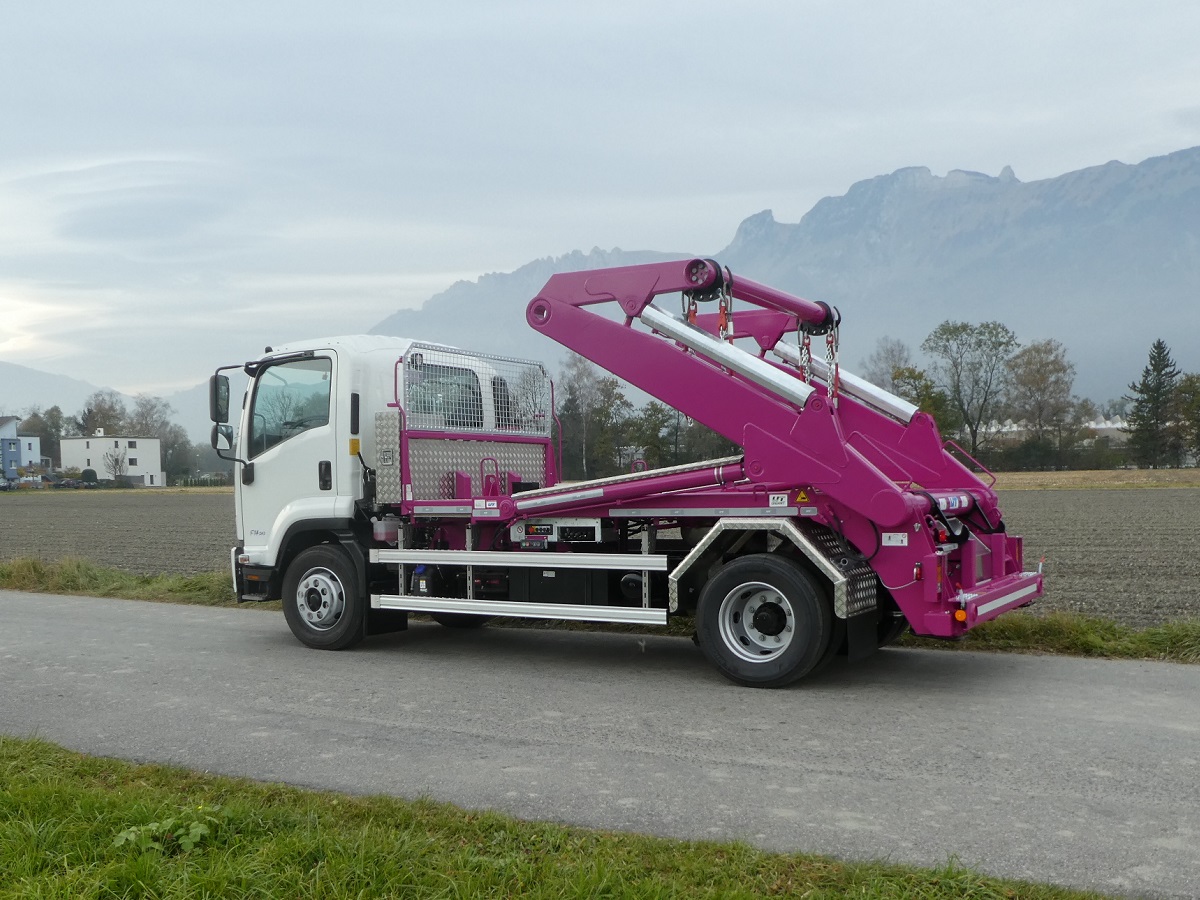 Dank dem «Welaki»-System (Wechseln, Laden, Kippen) kann dieser individuell abstimmbare Absetzkipper Mulden auch auf engem Raum stellen.