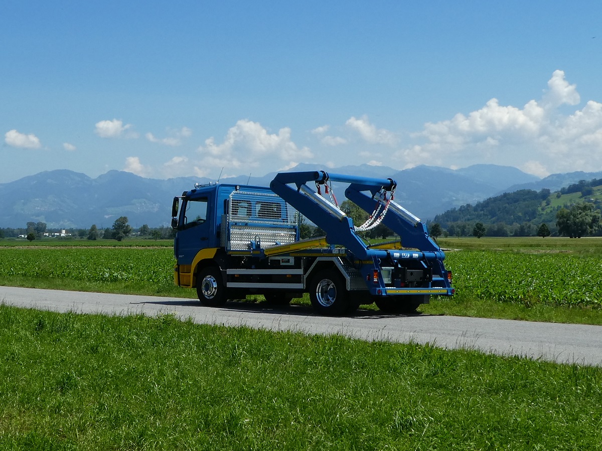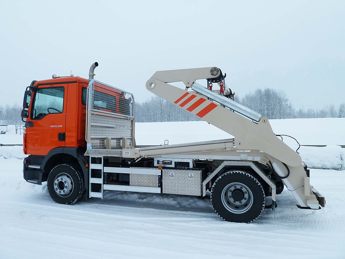 Der Wendige: Der Knickarm-Absetzkipper GIGANT 12K Comfort (verfügbar ab einer Baubreite von 2.30 Metern) eignet sich ausgezeichnet für leichte Transporte. Die spezielle Grundkonstruktion garantiert einen tiefen Kilometerpreis. Insbesondere Entsorgungs-Spezialisten schätzen diesen Kipper für kleinrädrige Lastwagen.