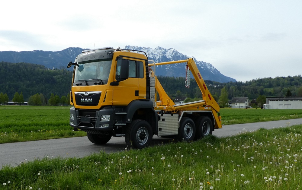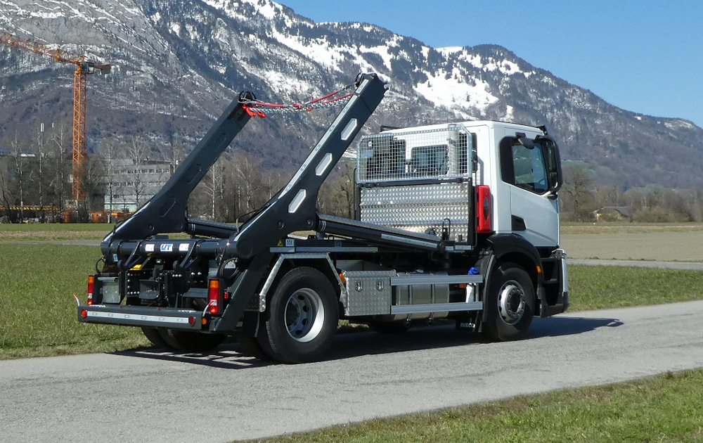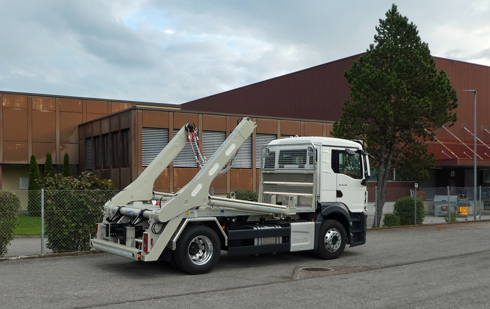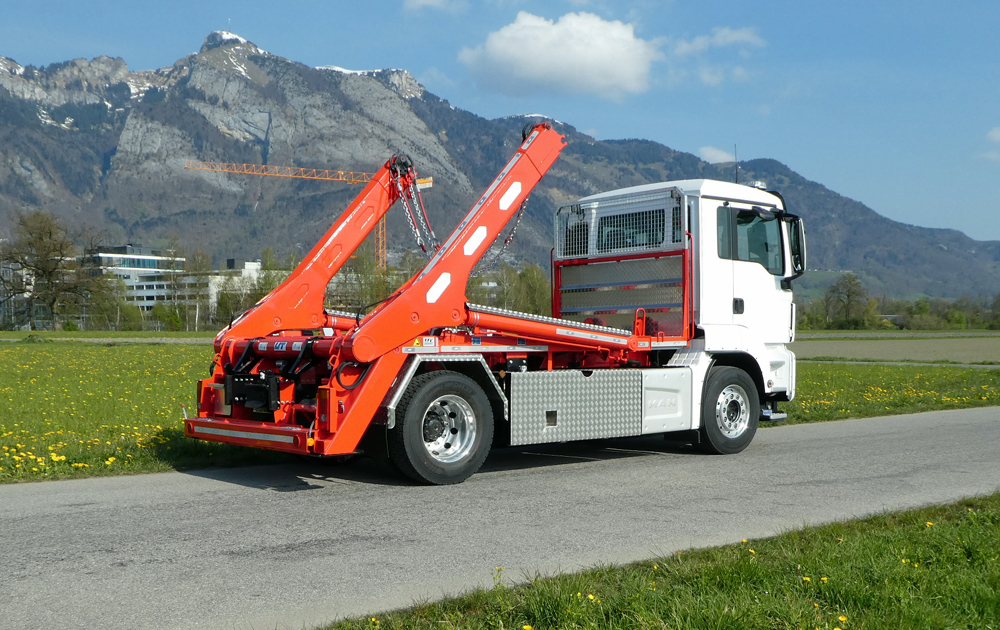Der Allrounder: Der Teleskop-Absetzkipper GIGANT 180T (verfügbar ab einer Baubreite von 2.30 Metern) ist das Standardmodell für Baustellen und für die Entsorgungswirtschaft. Mit diesem Absetzkipper verfügen Sie über ein vielseitig einsetzbares Fahrzeug, das Mulden und Container effizient auf- und ablädt.